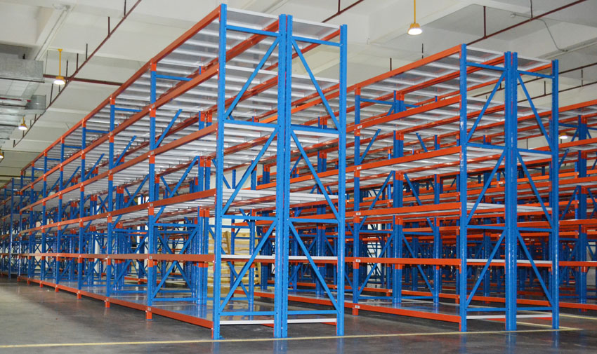 貨架的立柱為藍色,橫梁為桔紅色,層板為白色,這也是典型的色彩搭配,使倉庫的色彩錯落有致,擺放貨物時,也比較顯眼。