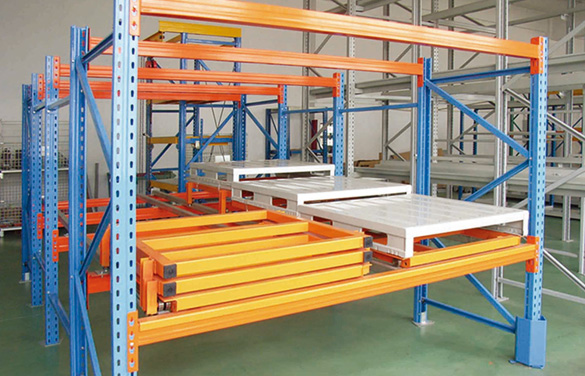 后推式貨架是為提高保管效率而設計的形式,其原理是在前后橫梁間以多層臺車重疊相接,在貨架前端將貨物置于臺車上,后存儲貨物時叉車會將原先貨物推向里面。