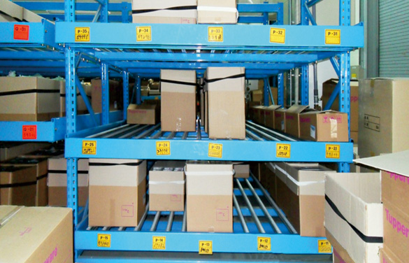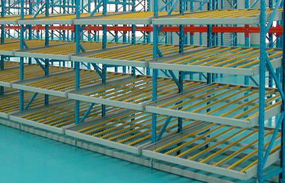 流利式貨架采用輥輪鋁合金、鈑金等流利條,將貨物置于滾輪上,利用一邊通道存貨,另一邊通道取貨。料架朝出貨方向向下傾斜,貨物在重力作用下向下滑動。